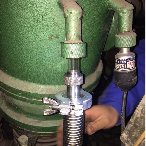 采用安徽91香蕉视频APP下载安卓科技有限公司的A100型91香蕉污视频,采用負壓法檢漏。將檢漏儀與真空爐體通過波紋管連接。用氦氣袋向真空爐體表麵噴氦。因為爐體內外存在壓差,氦氣會通過漏孔進入真空爐體內部,最終被氦檢儀捕捉到,如果氦檢儀報警,說明此處有泄漏。這種方法具有檢測精度高,靈敏度高,花費時間短等優點。